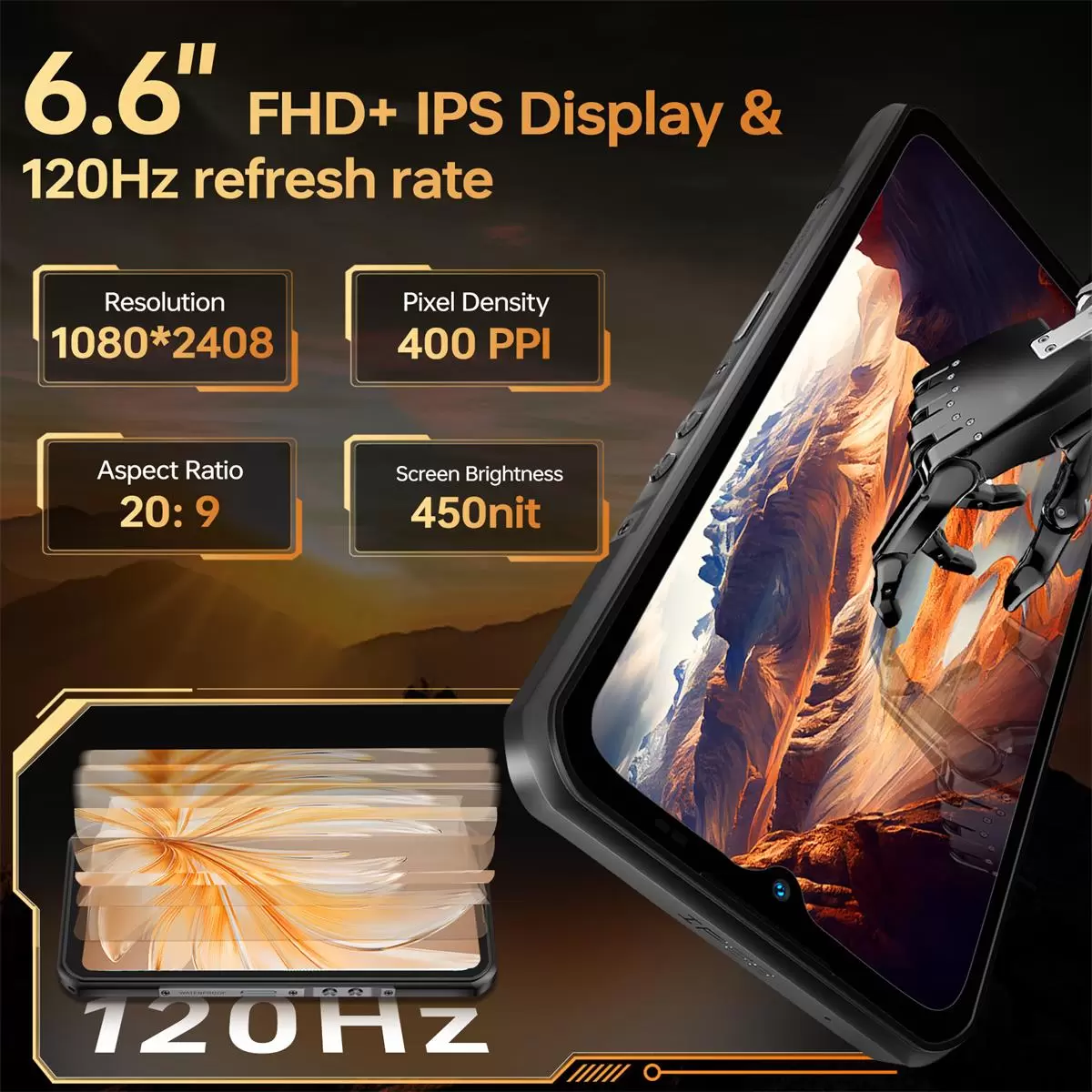 3. 6.6″ FHD+ 120Hz & 11000mAh: OUKITEL WP62: Brilliant visuals and extreme endurance. The 6.6-inch FHD+ display of the OUKITEL WP62 5G outdoor smartphone delivers razor-sharp details and vibrant colors – for an impressive viewing experience in any situation. With a smooth 120Hz refresh rate, every scroll, game, and stream runs up to twice as smoothly as on ordinary phones. Thanks to the massive 11000mAh battery, you enjoy a standby time of up to 1375 hours and will need to charge your device only rarely. With 33W fast charging, you’ll be ready to go again quickly when needed.