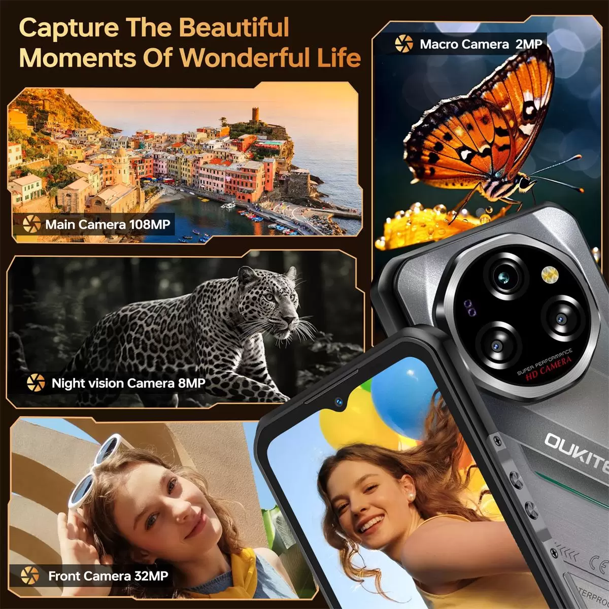 4. 108MP Triple Camera | Clear by Day & Night: The OUKITEL WP62 outdoor smartphone turns every moment into a picture of professional quality. The high-resolution 108MP main camera captures every detail in stunning sharpness. Perfect for studio-quality portraits and selfies, the 32MP front camera ensures you always look your best. The dedicated 8MP night camera masters even the most difficult lighting conditions, delivering vibrant, bright shots even in the dark. Discover a hidden world of the smallest details with the 2MP macro lens. The WP62 gives you all the tools to unleash your creativity – in photos and videos. Every moment comes alive.